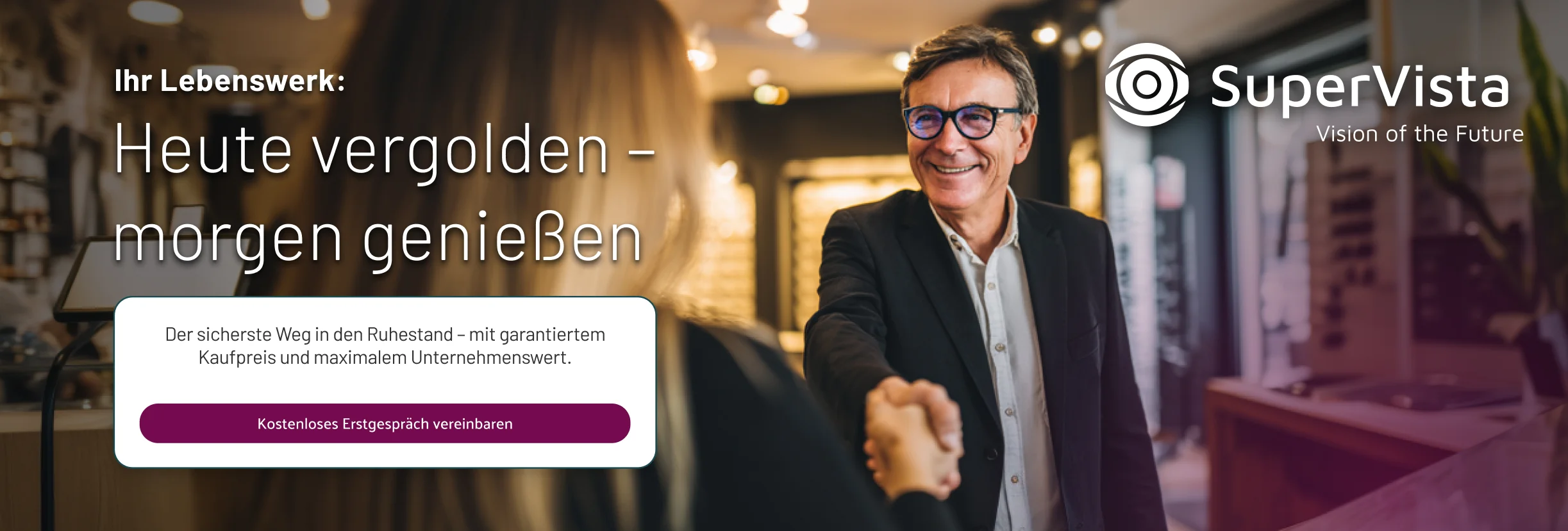 SuperVista kauft Ihr Unternehmen – zu einem Preis, den Sie selbst aktiv steigern. Sie bestimmen den Zeitpunkt, wir sichern den Wert.